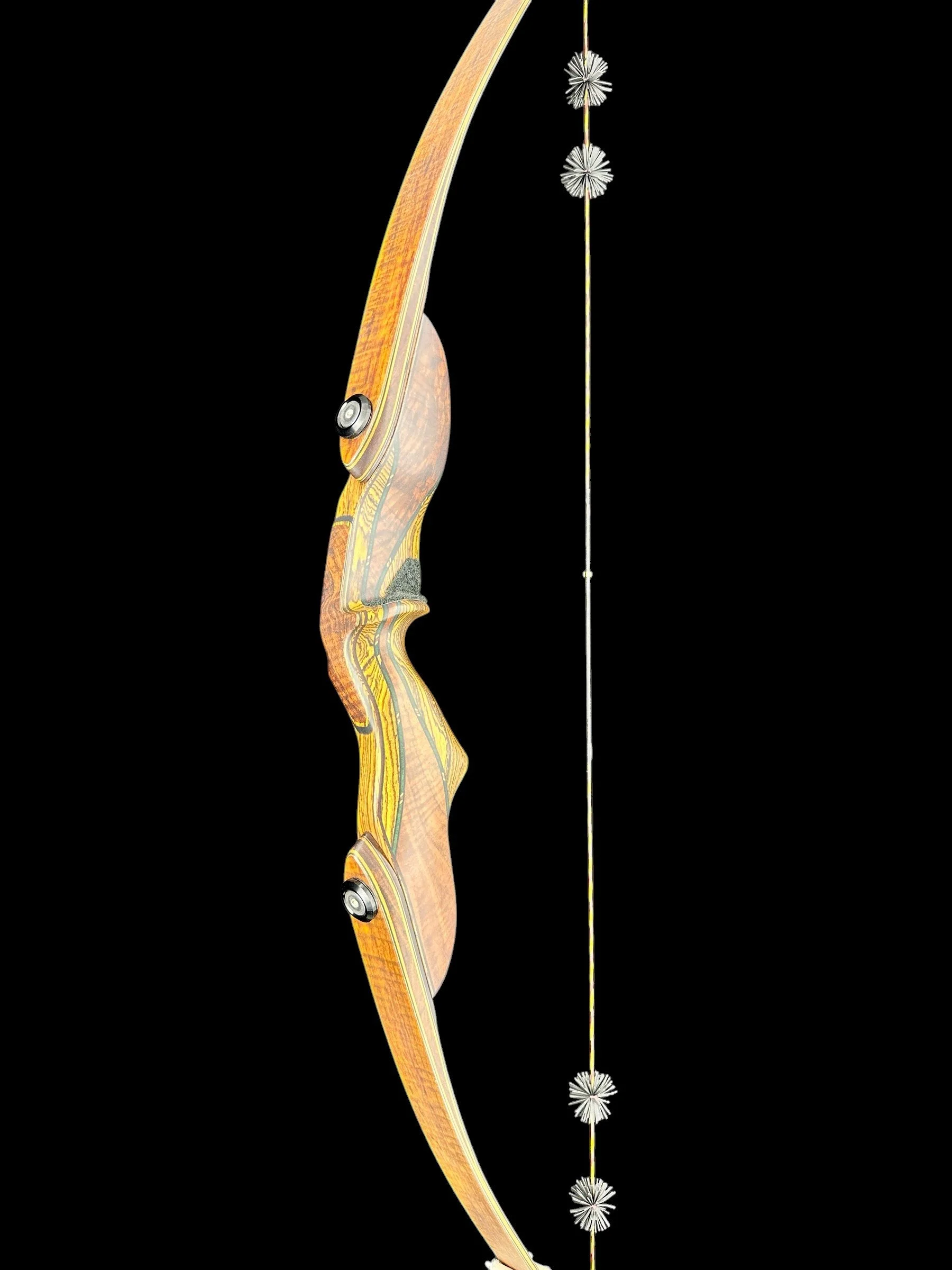 25M- Coyote FXT SuperCross Recurve 62" 48#@28" Exhibition grade curly crotch figure Claro walnut and bocote riser, emerald mosaic accent stripes with medium grip, SuperCross recurve limbs with stained curly maple veneers, bamboo and carbon limb cores $1,540
